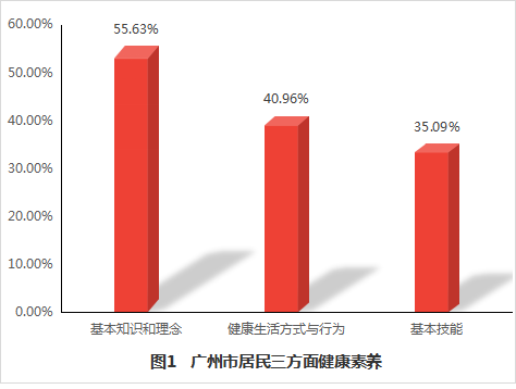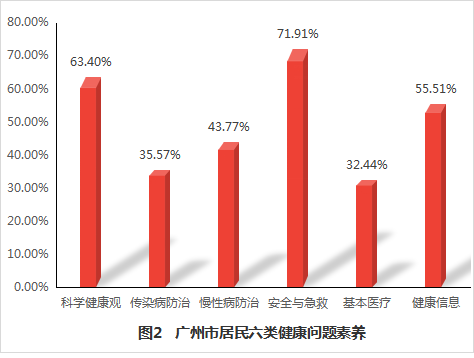 三个方面健康素养水平以基本知识和理念素养最高,达55.63%,基本技能素养相对比较欠缺,为35.09%,六类健康问题健康素养水平最高的是安全与急救素养,高达71.91%,最低的是基本医疗素养(32.44%)。