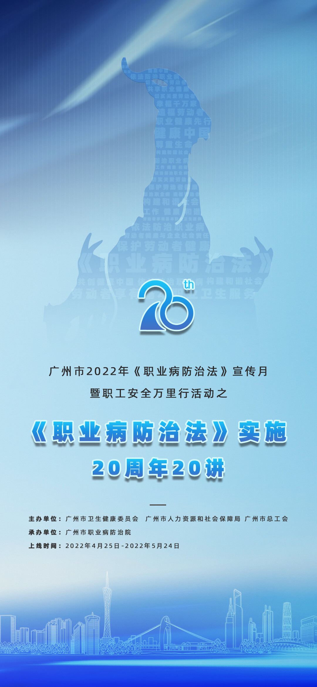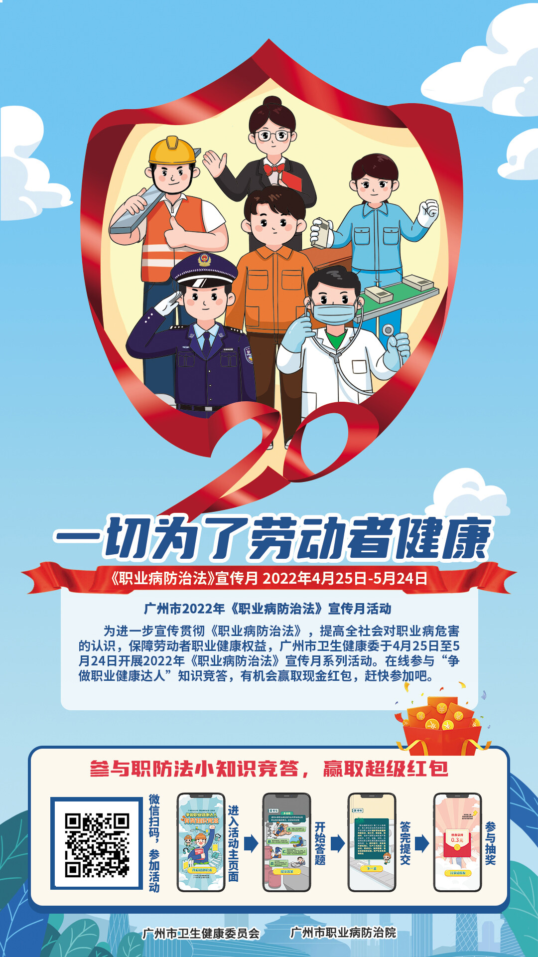 2002年5月1日,《中华人民共和国职业病防治法》正式颁布实施,每年“五一”劳动节前的最后一周,是全国《职业病防治法》宣传周,今年是我国《职业病防治法》实施第20周年,主题为“一切为了劳动者健康”,广州市卫健委、广州市民政局、广州市人社局、广州市医保局、广州市总工会联合开展广州市2022年《职业病防治法》宣传月暨职工安全健康万里行活动,在此期间将开展专家宣讲、作品征集、有奖知识竞答等系列活动,文末更有精美职业健康宣传材料可以免费获取: