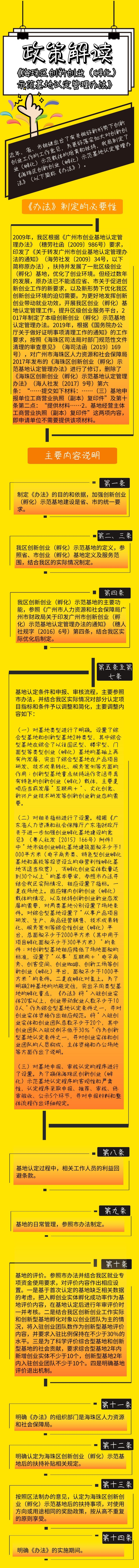 2009年,我区根据《广州市创业基地认定管理办法》(穗劳社函〔2009〕986号)要求,印发了《关于转发广州市创业基地认定管理办法的通知》(海劳社发〔2009〕34号,以下简称原办法),扶持并发展了一批区级创业(孵化)基地,优化了创业环境。但经过数年的发展,原办法已不能适应省、市关于促进创新创业工作的新要求,以及新形势下优化我区创新创业环境的迫切需要。为更好地发挥创新创业带动就业功效,开展我区创业(孵化)基地认定管理工作,提升区级创业服务平台,2017年制定了本级创新创业(孵化)示范基地认定管理办法。2019年,根据《国务院办公厅关于做好证明事项清理工作的通知》的工作要求,按照《海珠区司法局对部门规范性文件清理的审查意见》(海司法函〔2019〕169号),对广州市海珠区人力资源和社会保障局2017年发布的《海珠区创新创业(孵化)示范基地认定管理办法》进行了修订,删除了《海珠区创新创业(孵化)示范基地认定管理办法》(海人社发〔2017〕9号)第六条:“……提交如下材料:……(三)基地申报单位工商营业执照(副本)复印件”及第十条第二点:“提供材料……2.基地经营主体工商营业执照(副本)复印件”这两项内容,即申请单位不需要提供该项材料。