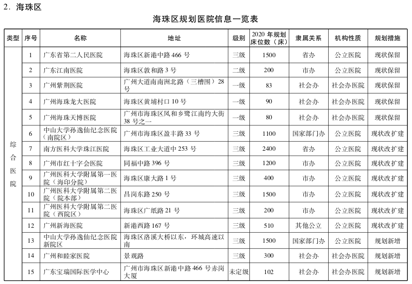海珠区为优化提升区,以整合现有医疗卫生资源、提升服务品质为策略。重点改善医疗卫生设施条件,加强海珠区东部、南部医疗资源配置,有针对性地增加妇女儿童、中西医结合、骨科等专科配置,除现有建设项目外,严控海珠区西部公立医院规模、床位不合理扩张;鼓励区域内优质公立医疗资源向资源薄弱地区转移,支持区内资源富余的二级以下公立综合医院,逐步转型为护理院、康复医院或者社区卫生服务机构,至少设置1家护理院、康复医院或医养结合机构。大力引进高水平、国际化特色明显的社会办医疗机构。