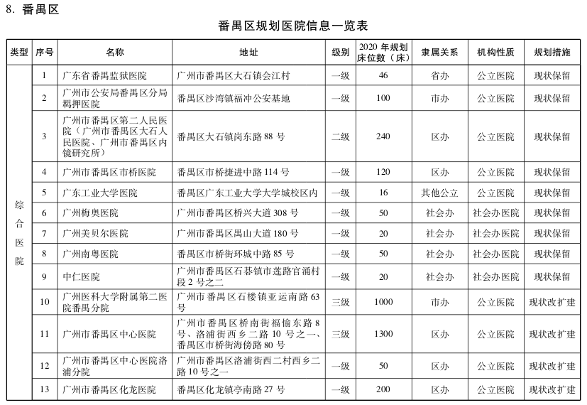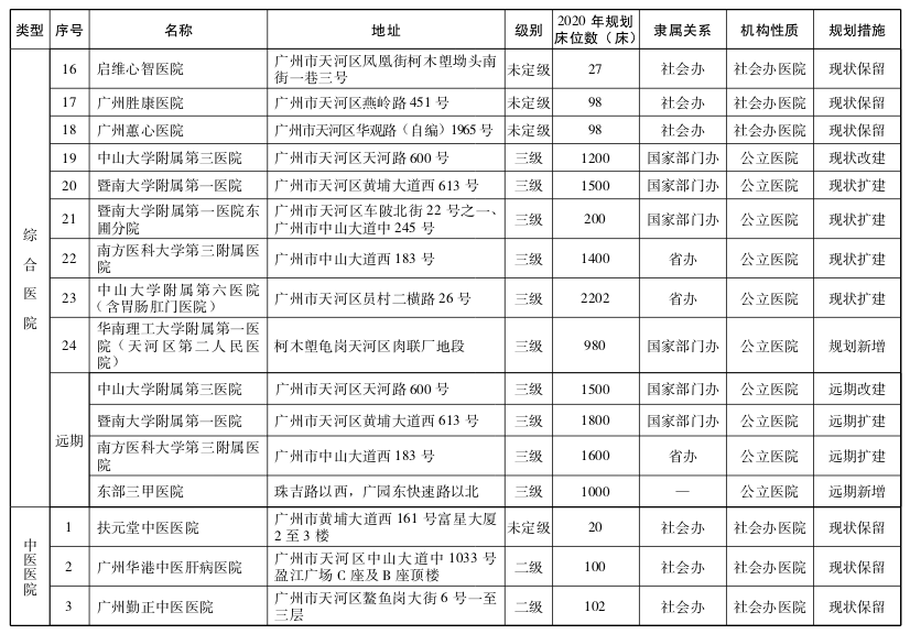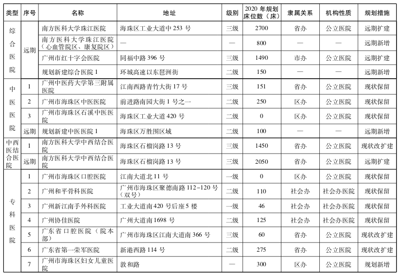 2020年,广州市共规划综合医院169间,其中现状保留87间,规划新增22间,改扩建(含迁建)60间。