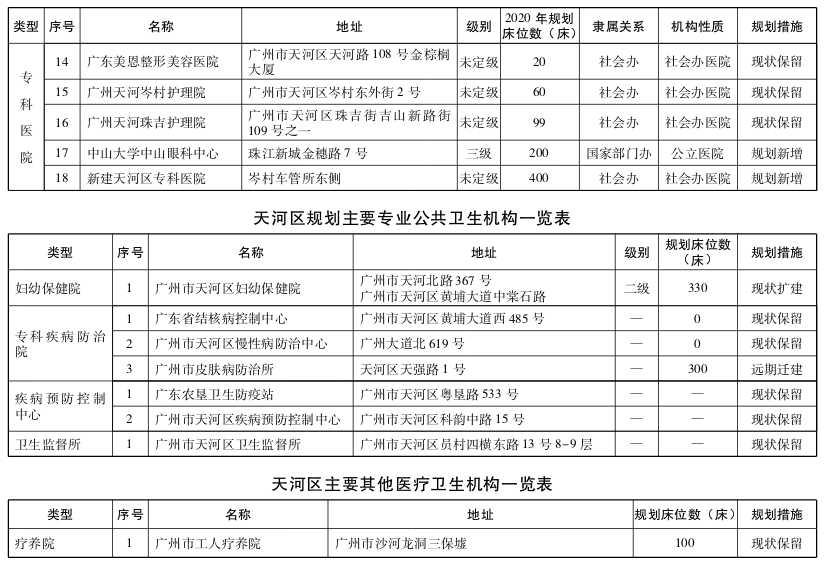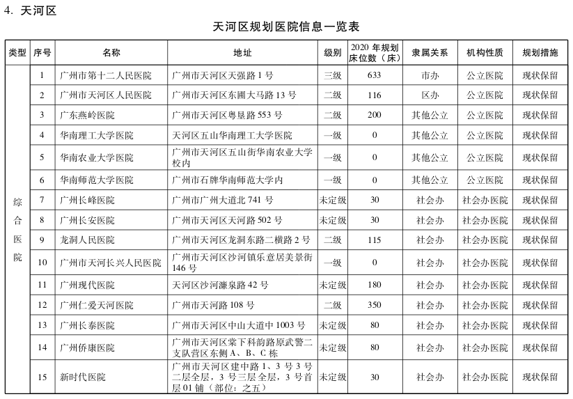 天河区为优化提升区,以整合现有医疗卫生资源、引进高水平社会办医疗机构为策略。重点增加天河东部、北部医疗资源配置,规划设置相应规模的公立医疗卫生机构,除现有建设项目外,严控天河区西南部公立医院规模、床位不合理扩张;鼓励优质社会资本提供妇女儿童、老年护理、口腔、中医等专科服务;鼓励区域内优质公立医疗资源向资源薄弱地区转移,支持区内资源富余的二级以下公立综合医院,逐步转型为护理院、康复医院或者社区卫生服务机构,至少设置1家护理院、康复医院或医养结合机构。