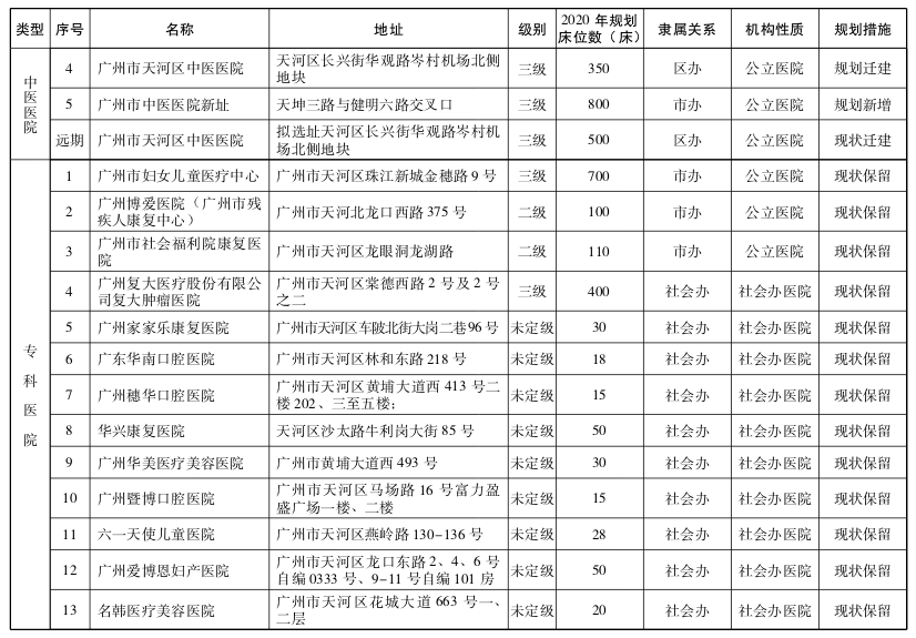 2020年,广州市共规划中医医院(中西医结合医院)40间,其中现状保留19间,规划新增3间,改扩建(含迁建)18间。