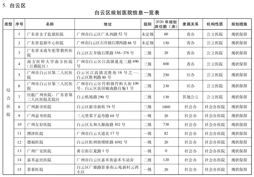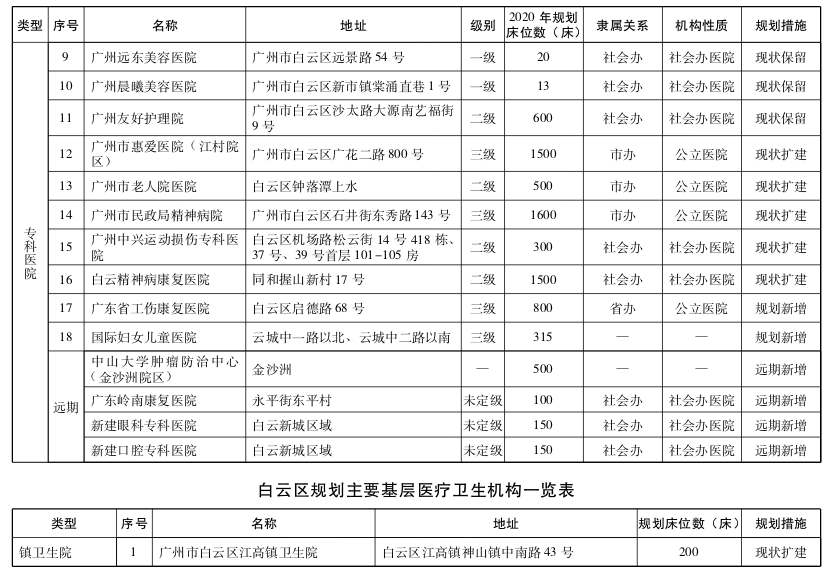 白云区为扩容提质区。白云南部未来应实现“量足”到“质优”的转变,重点调整医疗资源布局和结构,重点增加康复、老年护理、妇女儿童、精神卫生等紧缺专科的床位配置;白云北部着重扩容,在钟落潭镇、龙归城等区域规划设置相应规模的公立医疗卫生机构,适当增加床位配置;支持区内资源富余的二级以下公立综合医院,逐步转型为护理院、康复医院或者社区卫生服务机构,至少设置1家护理院、康复医院或医养结合机构;重点引进高水平社会办医疗机构,建设广州国际健康产业城、广州国际专科医疗中心。