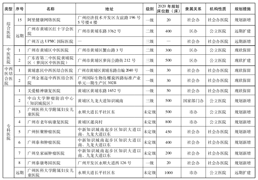 黄埔区为扩容提质区。调整黄埔南部医疗资源布局和结构,重点增加黄埔北部综合、妇女儿童、肿瘤、康复等公立医疗资源配置;鼓励社会资本设置第三方检验检测、肿瘤、老年护理、康复、健康管理、互联网医院等医疗机构;至少设置1家护理院、康复医院或医养结合机构;大力发展健康产业,建设广州科学城、广州国际生物岛、中新广州知识城。