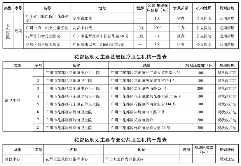 花都区为扩容提质区。加大对区域医疗资源的配置力度,重点增加妇女儿童、脑科、康复、口腔等公立医疗资源配置;增加镇卫生院床位配置;鼓励优质社会资本提供妇产、老年护理、康复、自愿戒毒等专科服务;至少设置1家护理院、康复医院或医养结合机构。
