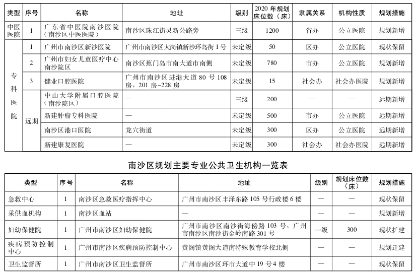 南沙区为扩容提质区。加大对区域医疗资源的配置力度,增加综合、妇女儿童、口腔、肿瘤、中医等医疗资源;至少设置1家护理院、康复医院或医养结合机构;鼓励社会资本引进国际化高端医疗资源,以国际化视野和服务标准建造集临床医疗、健康管理、特色专科聚集的,立足港澳、辐射东南亚的高端医疗产业链,建设南沙新区国家健康医疗旅游示范基地。允许南沙区在现有规划基础上,规划新增1家以上综合或专科医院。