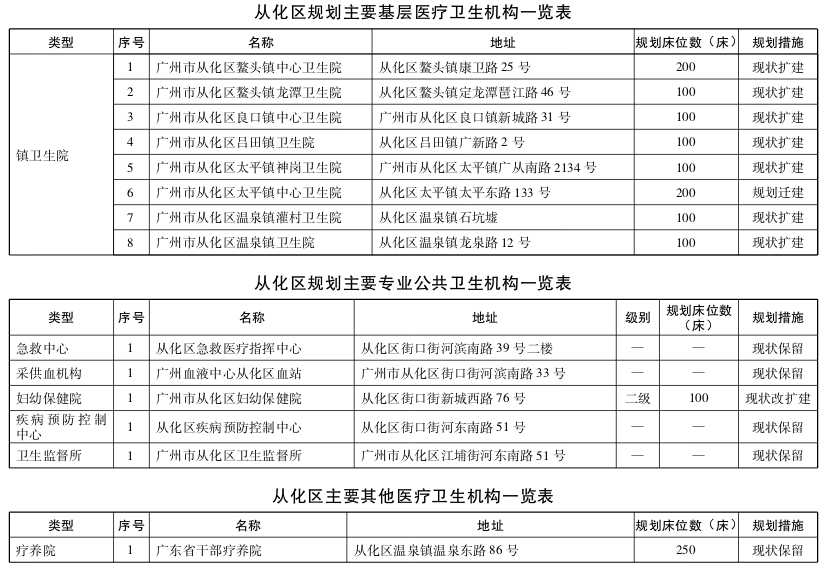 至2020年,从化区规划常住人口90万人。规划综合医院6个,中医医院1个,专科医院5个。规划急救中心1个,采供血机构1个,妇幼保健院1个,疾病预防控制中心1个,卫生监督所1个,疗养院1个。按照基层医疗卫生机构规划原则,结合常住人口数量,规划(2035年)镇卫生院8个,社区卫生服务中心(站)14个。