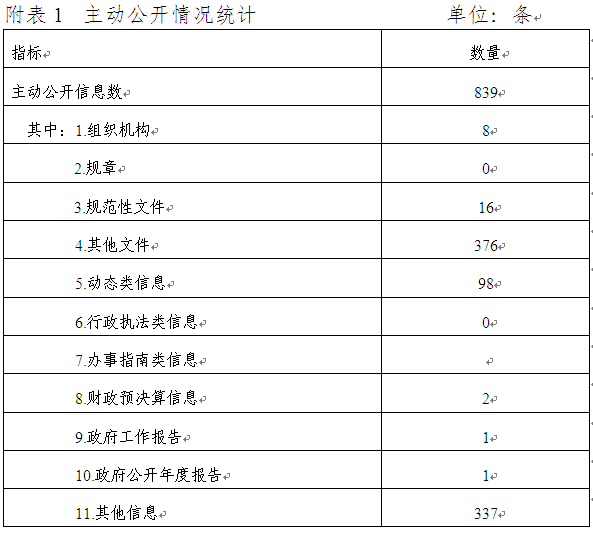本单位2015年全年主动公开政府信息839条,其中组织机构信息8条、规范性文件16件、其他文件376件、动态类信息98条、财政决算信息2条、政府工作报告1件、政府信息公开年度报告1份及其他信息337条。在主动公开的信息中,属于本单位业务类信息490条,占总体的比例为58.4%。