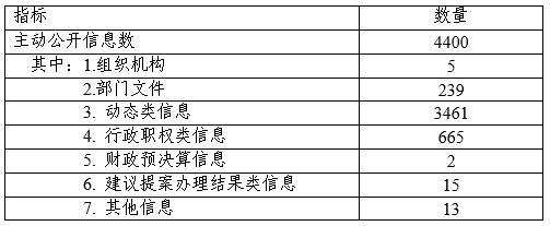 我委2016年全年主动公开政府信息4400条,其中:1.组织机构类信息5条;2.部门文件类(包括规章、规范性文件等)信息239条;3.动态类信息3461条;4.行政职权类信息(包括行政审批、执法等)665条;5.财政预决算信息2条;6.建议提案办理结果类信息15条;7.其他信息13条。