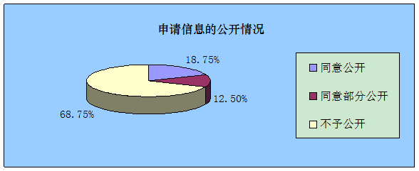 “不予公开”11件,占总数的68.75%。主要是因为申请人所申请的信息不存在或不属于我局所掌握的信息。其中,“信息不存在”的2件,占总数的12.5%。主要是因为申请人所申请的信息不存在;“非本机关政府信息”的9件,占总数的56.25%,主要是因为申请人所申请的信息不是我局所掌握的信息。
