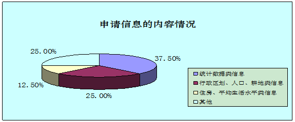 从申请的信息内容看,其中6件属国民经济各行业的统计数据类信息,占比37.5%;4件涉及行政区划、人口、耕地面积等方面的信息,占比25%;2件涉及住房、平均生活水平等方面的信息,占比12.5%;4件涉及其他方面的信息,占比25%。