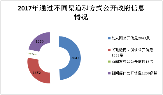 在主动公开信息工作中,通过不同渠道和方式公开政府信息情况:通过我局公众网公开信息2843条,通过民政微博、微信公开信息1652条,通过新闻发布会公开信息16次,通过新闻媒体公开信息1250多篇。