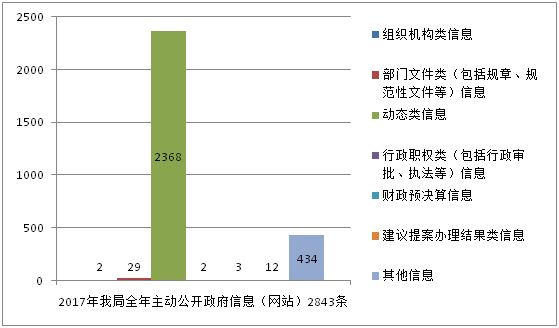 2017年我局全年主动公开政府信息(网站)2843条,其中:1.组织机构类信息2条;2.部门文件类(包括规章、规范性文件等)信息29条;3.动态类信息2368条;4.行政职权类(包括行政审批、执法等)信息2条;5.财政预决算信息3条;6.建议提案办理结果类信息12条;7.其他信息434条。