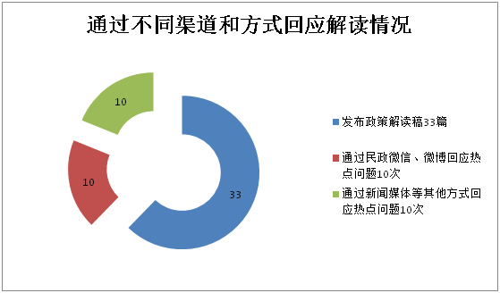 回应公众关注热点10次。通过不同渠道和方式回应解读情况:发布政策解读稿33篇,通过民政微信、微博回应热点问题10次,通过新闻媒体等其他方式回应热点问题10次。