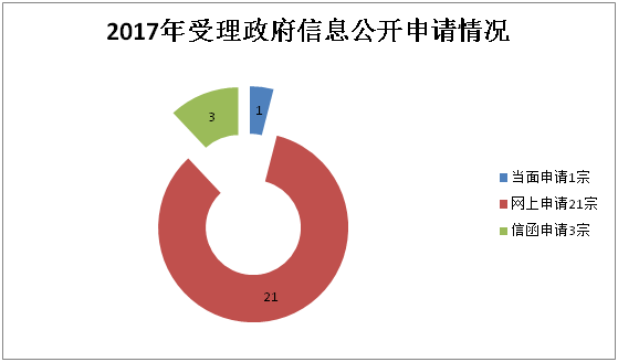 2017年,我局共受理政府信息公开申请25件。其中,当面申请1宗,占4%;网上申请有21宗,占84%;信函申请3宗,占12%。