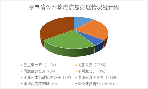 答复政府信息公开申请共17宗。其中,属已主动公开范围2宗,占11.8%;同意公开4宗,占23.5%;同意部分公开0宗,占0%;不同意公开0宗,占0%;不属于本行政机关公开1宗,占5.9%;申请信息不存在4宗,占23.5%;申请内容不明确0宗,占0%;其他答复情形6宗,占35.3%。