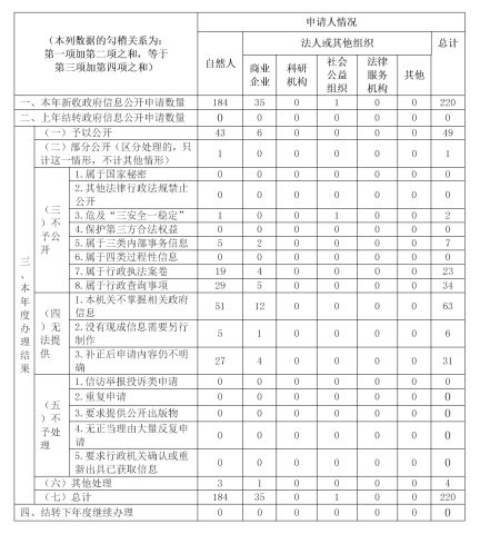 全年答复政府信息公开申请共220件。其中,予以公开49件,占22.27%;部分公开1件,占0.45%;不同意公开66件,占30%;本行政机关不掌握的信息63件,占28.64%;没有现成信息需另行制作6件,占2.73%;申请内容不明确31件,占14.09%;其他答复情形4件,占1.82%。