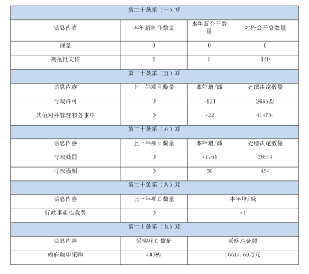 2019年,我局通过网站、微信微博、新闻媒体主动公开各类政府信息38014条。其中,1.组织机构类信息51条;2.部门文件类信息156条;3.动态类信息486条;4.行政执法类信息28554条;5.办事指南类信息210条;6.财政预决算信息15条;7.其他信息1099条。通过不同渠道和方式发布政府信息情况:通过政府网站公开政府信息30571条,微信发布信息653条,微博发博710条,新闻媒体发布信息6080条。