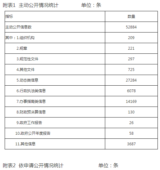 我区人民政府2015年主动公开政府信息52884条,其中:1.组织机构 209条;2.规章221条;3.规范性文件297条;4.其他文件725条;5.动态类信息27284条;6.行政执法类信息6078条;7.办事指南类信息14169条;8.财政预决算信息130条;9.政府工作报告26条;10.政府公开年度报告58条;11.其他信息3687条。