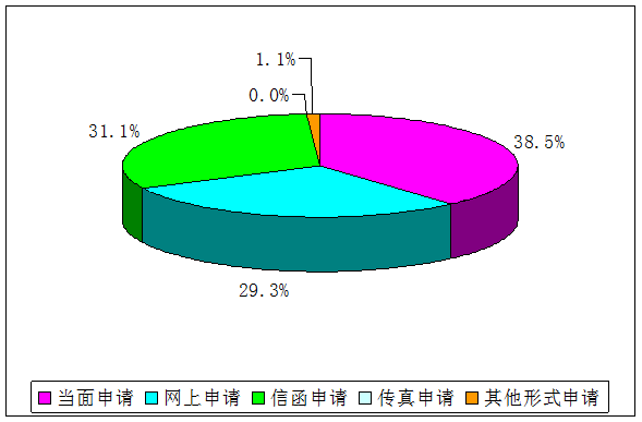 本区人民政府和区府直属各部门2017年共受理信息公开申请904件,其中当面申请348宗,占38.5%;网上申请265宗,占29.3%;信函申请281宗,占31.1%;传真申请0宗;其他形式申请10宗,占1.1%。
