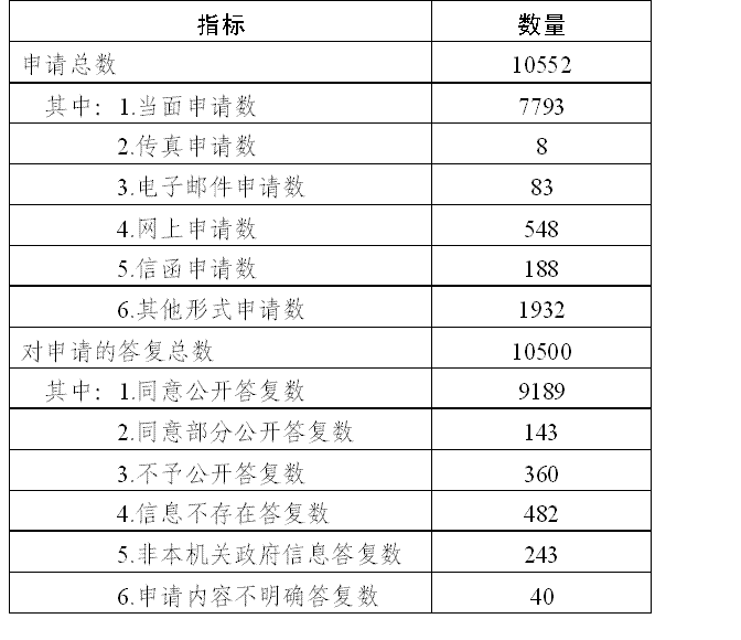 在10552件政府信息公开申请中,已经答复的10500件,占99.51%。其中,“同意公开”的9189件,占87.10%,“同意部分公开”的143件,占1.35%,“不予公开”的360件,占3.41%,“信息不存在”的482件,占4.57%,“非本行政机关政府信息”的243件,占2.3%,“申请内容不明确”的40件,占0.38%,其他情况的43件,占0.41%。