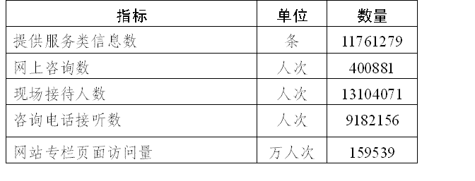 全市共接受市民咨询2268.7万人次,其中现场咨询1310.4万人次,电话咨询918.2万人次,网上咨询40.1万人次,提供服务类信息1176.1万条。网站专栏页面访问量超过 159539万人次。