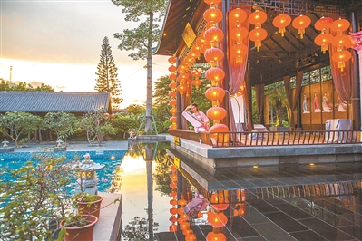 在御水古温泉,古装演出、古代娱乐、风雅礼仪、美食盛宴等精品国潮元素一一具备。多款汉服供游客挑选,游客在古风古色的温泉区,无论在哪一个角落,都可以拍出完美的照片。