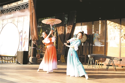 游客在温泉度假村还能欣赏汉唐歌舞,古筝和舞蹈的配合,演绎着汉唐时光的古典美
