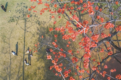 每年的三四月份,春日回暖,木棉花就会开满梢头。然而,今年进入二月,广州大街小巷的木棉花就已竞相开放,一朵朵木棉花火红如炬、俏立枝头,一片片绚丽的艳红在春风中悠然摇曳。