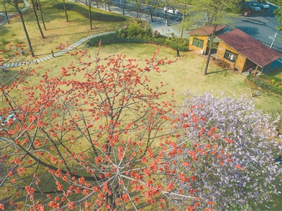 街道上,一幢幢高楼大厦和一棵棵挺拔木棉相映成趣,成排的花树与笔直的道路一齐延展,构成一幅幅和谐唯美的画面。公园里,三五成群的年轻人专程前来拍照、打卡,牵着孩子,扶着老人,在怒放的木棉树下留下最灿烂的笑容。