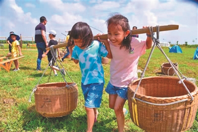 在增城区三江的世界幸福田园犇牛牧场,最近每逢周末,就有不少家长陪孩子来这里体验乡村生活,参加农耕劳动。他们在牧场里放牛牧马,在农趣园里学习各种农具,比如担柴、挑水,摇风车车谷,踏碓舂米,推磨磨豆腐,犁田耙地打辘轴等,忙得不亦乐乎。而在渔耕园里,游客们还能体验拉网捕鱼的渔夫之乐,收获满满。在这里,还可以参与劳动比赛,可以以家庭为单位参加比赛,父母负责倒谷子,孩子负责摇风车,看哪个最先将谷摇完。拉辘轴比赛对孩子们来说也十分新鲜有趣,辘轴是农村最常见的打田工具,家庭之间可进行比赛,一起将辘轴往前拉,往前滚,速度最快者为胜。