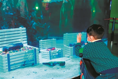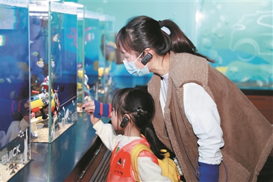 假期期间,除了欣赏海底新景观之外,亲子家庭可跟随讲解员一边探索海底世界,一边丰富海洋知识。作为海洋馆里的小明星,去年11月4日在正佳极地海洋世界里出生的广州首次成功繁育的小白鲸“小五”已经一岁多了,“小五”是中国第5头人工环境自然怀孕和顺产的小白鲸,如今已经长大不少,可爱的它得到了不少亲子家庭的喜爱。