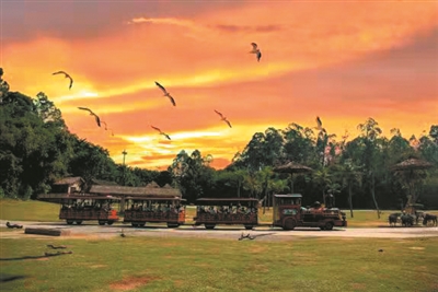 长隆野生动物世界里最近在园区景观设计中加入高科技沉浸式投影装置,每到傍晚时间,绚丽的灯光塑造出草原动物“大迁徙”的盛况,这种“傍晚看夕阳、夜间看动物”的游玩方式吸引了众多本地游客前来打卡。观赏夕阳的路线可以这样定制,在傍晚大概五点之后,游客可以搭乘园区的免费缆车,从熊猫乐园站乘坐天鹅湖线,在半空中环绕式领略夕阳之下的天空和洒落草原的霞光,随手拍都能拍出夕阳无限好的美景。缆车到站后还可以站在天鹅湖的鸿雁桥上领略大雁南飞、落日湖光的魅力。当夜幕降临,家长还可以带着孩子乘坐流光溢彩小火车游园,夜探光影交织的“东非大草原”,感受全新的沉浸式景观,体验不同的夜间动物世界,看看在夜里的动物习性和白天里的是否会不一样。