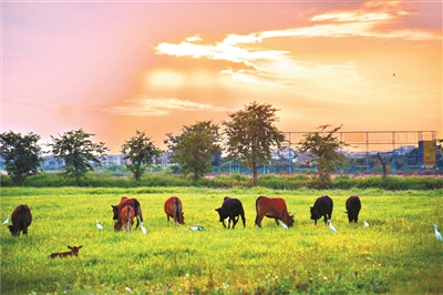 冬日里,在乡村田园里还能观赏到鹭鸟的踪迹,在田园美景中,随时可以欣赏“一行白鹭上青天”的美景。绿油油的草地上,黄牛、白马、绵羊在悠闲地吃着青草,好一幅乡村牧场的美丽图画!