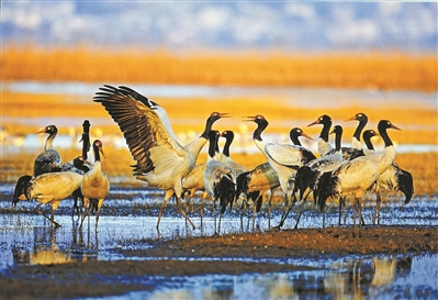 草海是中国三大高原湖泊(草海、滇池、青海湖)之一,也是贵州省最大的高原天然淡水湖泊,国家级自然保护区。它位于威宁县县城西南面,水域面积46.5平方公里,相当于8个西湖那么大。高山、淡水、湖泊再加上充足的日照,让草海成为候鸟越冬的最佳目的地。草海作为180余种计20万只鸟类的重要越冬地和迁徙中转站,还是我国特有的高原鹤类——黑颈鹤的主要越冬地之一。