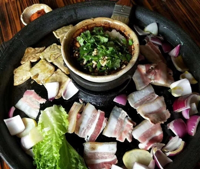 在毕节的大方县,活油烙锅独树一帜,亮点就在于锅顶那一碗活油蘸水,用大方皱椒配上生猪油,既辣又爽滑,烙好的食物往活油蘸水里一点,似乎才有了灵魂。在毕节,做烙锅所用的肉类都需要用酱油、芡粉拌好,等到油加热之后再放入锅中,再配上当地豆干,味道独树一帜。