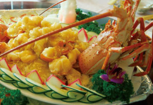 上汤焗龙虾是以龙虾为主料,配以原汁金华火腿汤炒熟,鮮龙虾吸收了浓郁的上汤精华,肉质洁白细嫩,味道鲜美,蛋白质含量高,脂肪含量低,营养丰富。特别适合滋补食用。