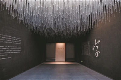 穿过春阳台的下沉庭院,步入展览大厅,头顶是模拟“天雨粟”仓颉造字的传说图景,“读书便佳”几个书法字苍劲有力;左边是《与道大适——中国读书人的安身与立命》展览前言,右边是对展览提纲挈领的“关键字”解读。