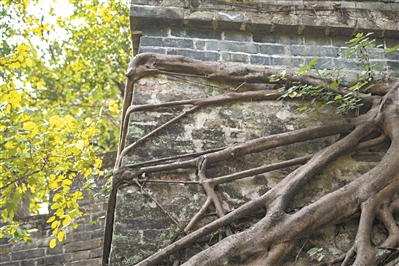 榕树:根须依附城墙攀爬,从垛口处开始生长,距离地面6米多。