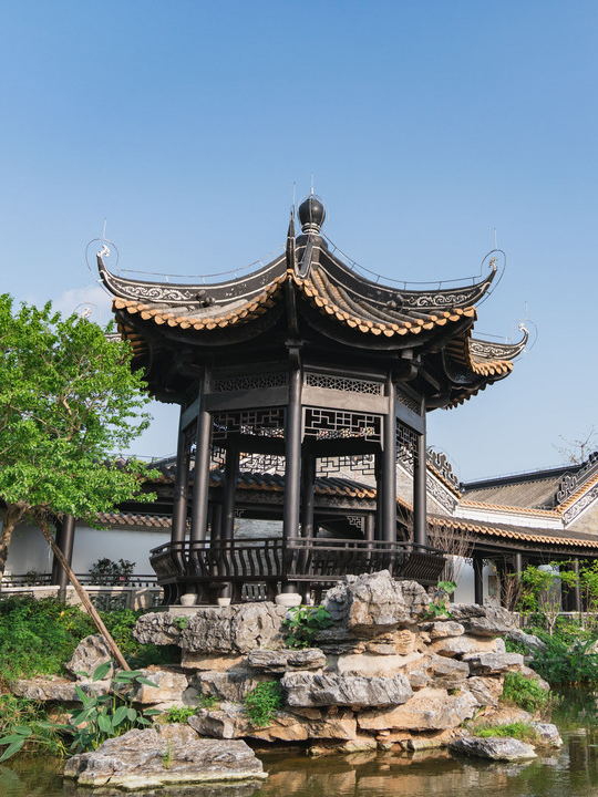 曲艺园紧挨着一座假山,园内还有枯山水的设计。山石、建筑、桥梁、步道依次叠落到海珠湖。“曲艺园对水的内在利用是相对偏少的,但没有围蔽的设计可以把视野延伸,设计上把右侧海珠湖容纳进来,所以说,曲艺园对水的利用是偏外在的。”郭昊栩介绍,市民可以坐在石头上听戏,或衬着山石留影。