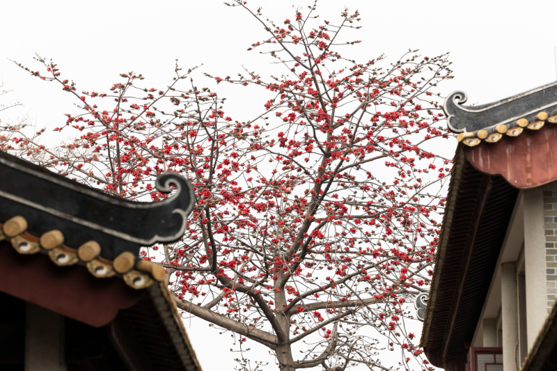 广州市海珠区纯阳古观,古建前的木棉已然盛放。