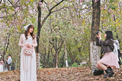 海珠国家湿地公园里,宫粉紫荆与樱花相继绽放,粉白花海在水岸之间延伸;华南农业大学紫荆大道上,花枝如云,微风拂过,花瓣轻轻飘落,铺成一条淡紫色的花路;中山纪念堂前,古木棉年年如约盛开,红花高举,与古建筑相映生辉。流花湖畔、二沙岛边、阅江路沿线,三角梅、紫荆、木棉次第开放,让整座城市仿佛生长在花海之中。