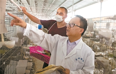 钟会权(后)是当地的贫困户,目前正在鸽场工作的他打算学好这门技术,将来自己也从事肉鸽养殖