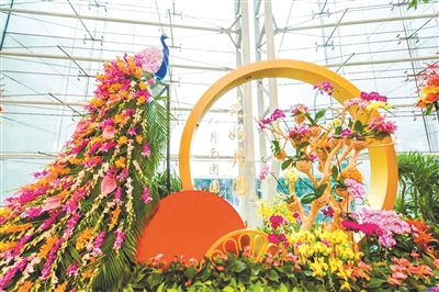 旅客在鲜花造型前打卡留念