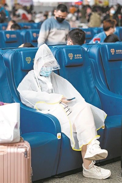 在南站三层候车大厅,人群中一位穿着雨衣戴着手套的旅客引人注目,蔡小姐是武汉人,在广州做幼儿园老师,因为放寒假,可以早早回武汉过年。她说,“全副武装”倒不是自己有多害怕,主要是因为家里有老人,她怕在路上、车上沾染细菌病毒,所以多做了一些防护。去年过年她没能回武汉,今年特意早早买好车票,回家团圆。