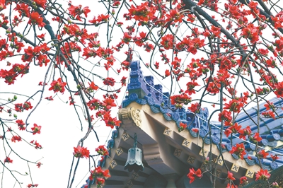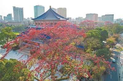 火红的木棉与中山纪念堂的蓝色瓦顶相映,如诗如画。