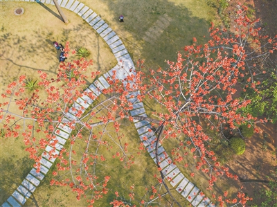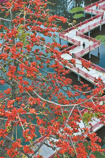 广州东山湖公园,九曲桥旁的木棉花如烈焰燃烧。