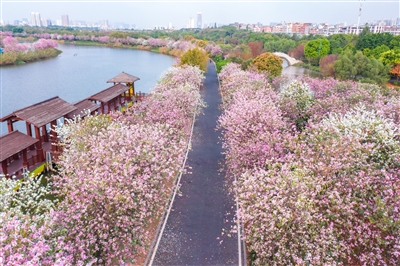 海珠湿地宫粉紫荆争相怒放,共同绘制成长达3.2公里的粉色梦境。