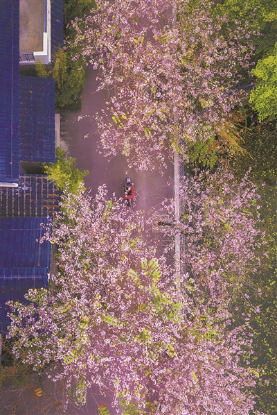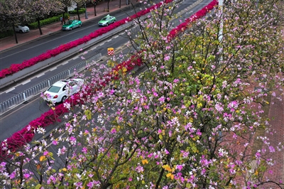 石榴岗河畔约6000株宫粉紫荆装点沿岸马路。
